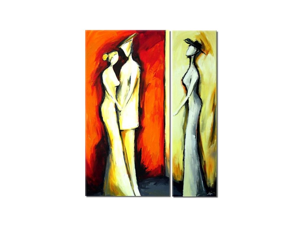 Dvoudílný ručně malovaný obrazový set s motivem obrazu ženy s partnerem a bez něj. Jednotlivé díly setu jsou vypnuty na dřevěných vypínacích blind rámech, které jsou opatřeny vypínacími klínky, které umožní případnou korekci plátna. Obrazový set je možné ihned pověsit do interiéru. Moderní obrazové sety jsou vhodnou dekorací každého interiéru. Velikost obrazu je 1 ks x 100 x 50 cm a 1 ks x 100 x 25 cm, celková velikost 100 cm x 75 cm.