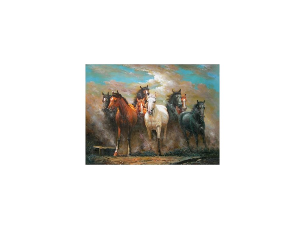 Obraz s motivem cválajícího stáda koní. Obraz je malovaný olejovými barvami na kvalitní malířské plátno vyšší gramáže, napnuté na vypínací (skrytý) 2 cm široký blind rám. Ten je opatřený klínky pro případné dopnutí plátna. Díky probarveným okrajům lze obraz ihned zavěsit na zeď, nebo je možné také zarámování do ozdobného rámu. Nabídku naleznete v sekci rámy a rámování. Součástí je háček určený k zavěšení obrazu.Buďte první, kdo napíše příspěvek k této položce.