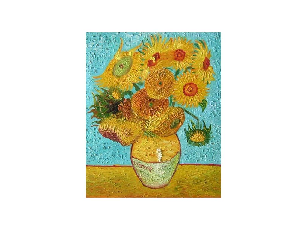 Známá reprodukce patnácti slunečnic od Vincenta Van Gogha známého pod názvem Slunečnice. Obraz je malovaný olejovými barvami na kvalitní malířské plátno vyšší gramáže, napnuté na vypínací (skrytý) 2 široký blind rám. Ten je opatřený klínky pro případné dopnutí plátna. Díky probarveným okrajům lze obraz ihned zavěsit na zeď, nebo je možné také zarámování do ozdobného rámu. Nabídku naleznete v sekci rámy a rámování. Součástí je háček určený k zavěšení obrazu.
