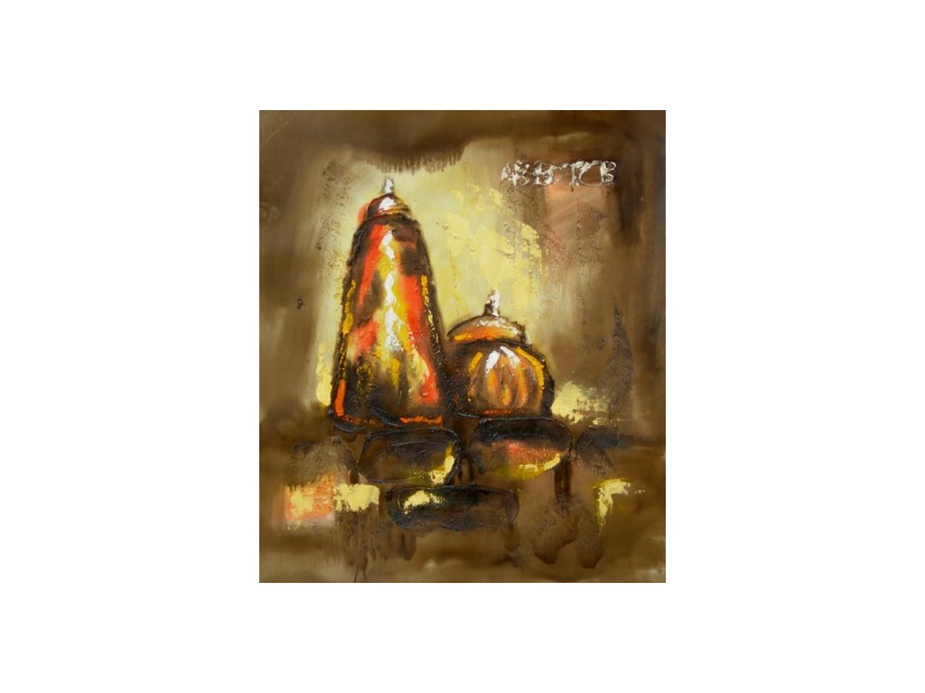 Na obraze je namalováno zátiší s vázou, obraz je laděn do tmavších odstínů hnědé barvy. Obraz je malovaný olejovými barvami na kvalitní malířské plátno vyšší gramáže, napnuté na vypínací (skrytý) 2 cm široký blind rám. Ten je opatřený klínky pro případné dopnutí plátna. Díky probarveným okrajům lze obraz ihned zavěsit na zeď, nebo je možné také zarámování do ozdobného rámu. Nabídku naleznete v sekci rámy a rámování. Součástí je háček určený k zavěšení obrazu.