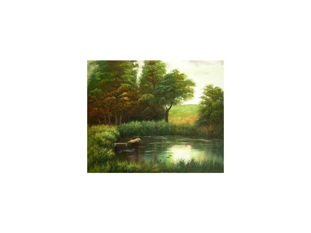 Na obraze je namalován lesík s jezerem a prasátko které skáče do jezera. Obraz je malovaný olejovými barvami na kvalitní malířské plátno vyšší gramáže, napnuté na vypínací (skrytý) 2 cm široký blind rám. Ten je opatřený klínky pro případné dopnutí plátna. Díky probarveným okrajům lze obraz ihned zavěsit na zeď, nebo je možné také zarámování do ozdobného rámu. Nabídku naleznete v sekci rámy a rámování. Součástí je háček určený k zavěšení obrazu.Buďte první, kdo napíše příspěvek k této položce.