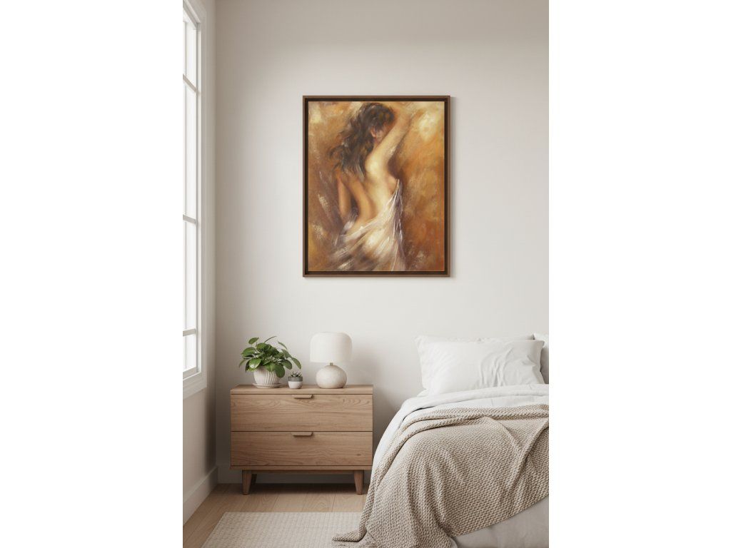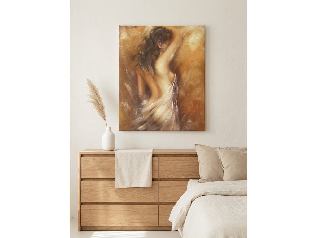 Tento ručně malovaný obraz zaujme na první pohled svou jemností, pohybem a emotivní atmosférou. Zachycuje ženskou siluetu v něžném, lehce tajemném pojetí, kde se smyslnost snoubí s elegancí a uměleckou lehkostí.