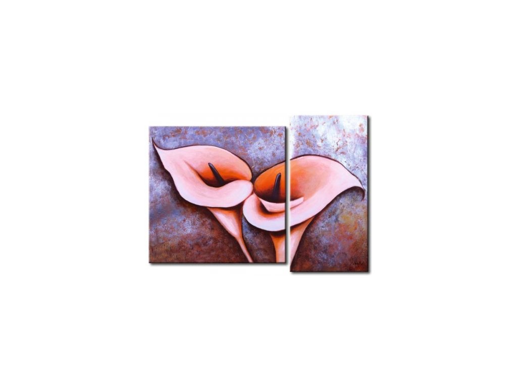 Ručně malovaný dvoudílný obrazový set na plátně. Je vypnutý na rámu, který umožňuje případnou korekci napnutí plátna. Obrazový set se skládá ze dvou samostatných obrazů, které se vzájemně doplňují. Motivem tohoto setu jsou elegantní květy kal. Obraz je vhodným doplňkem každého interiéru. Velikost 1 ks x 80 x 80 cm a 1 ks 90 x 45 cm.