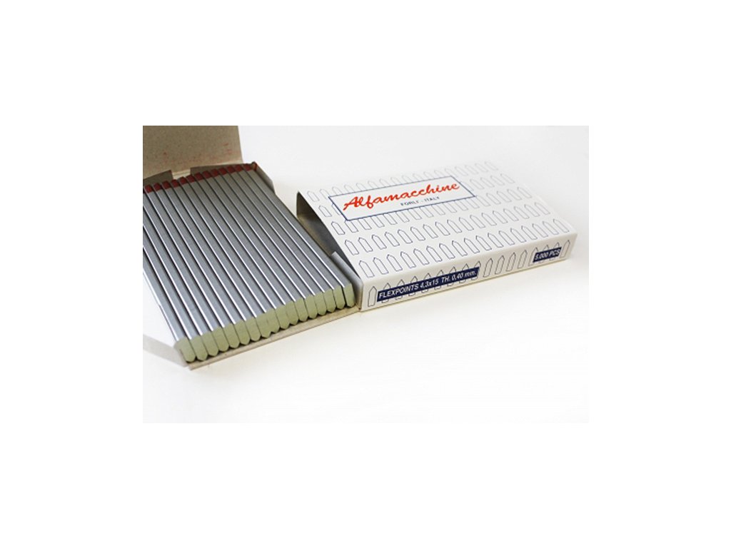 Flexi hroty pro ruční i pneumatické sponkovačky. Výrobce Alfamacchine. Velikost 15 x 4,3 mm, th. 0,4 mm. Baleno po 5 000 Ks.