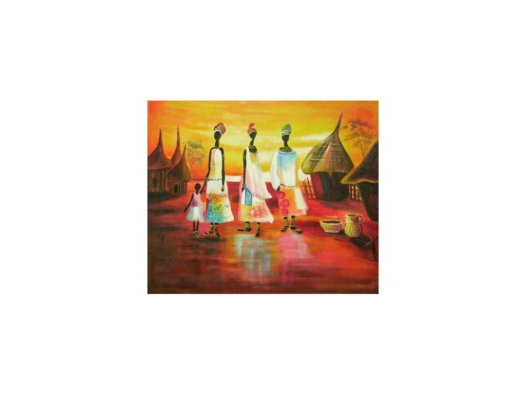 Na obraze jsou tři ženy a dítě uprostřed vesnice, obraz je laděn do oranžovo-červené barvy. Obraz je malovaný olejovými barvami na kvalitní malířské plátno vyšší gramáže, napnuté na vypínací (skrytý) 2 cm široký blind rám. Ten je opatřený klínky pro případné dopnutí plátna. Díky probarveným okrajům lze obraz ihned zavěsit na zeď, nebo je možné také zarámování do ozdobného rámu. Nabídku naleznete v sekci rámy a rámování. Součástí je háček určený k zavěšení obrazu.