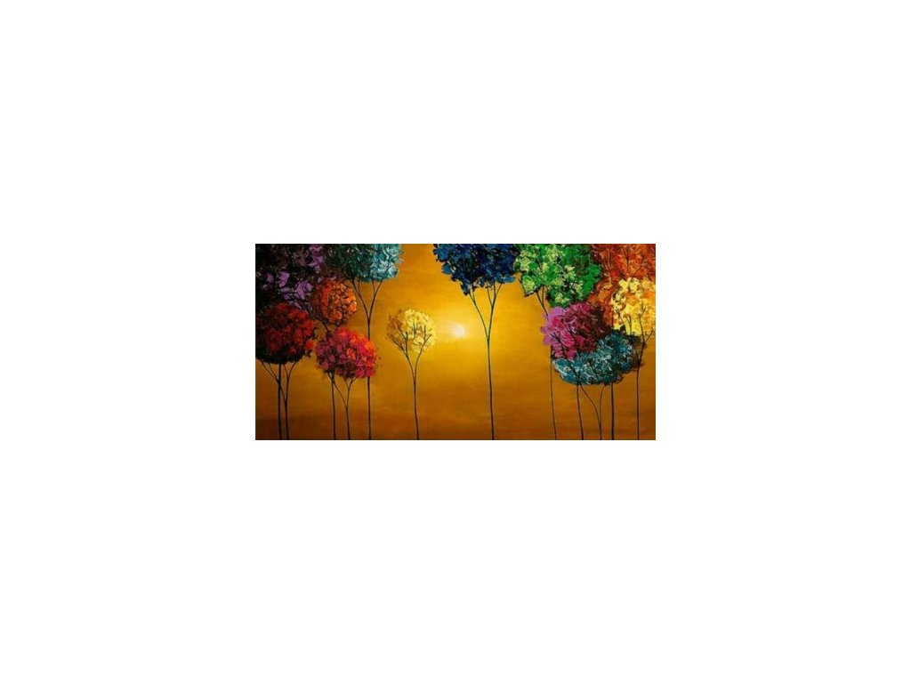 Obraz na kterém jsou stromy v pestrých barvách. Obraz je malovaný olejovými barvami na kvalitní malířské plátno vyšší gramáže, napnuté na vypínací (skrytý) 2 cm široký blind rám. Ten je opatřený klínky pro případné dopnutí plátna. Díky probarveným okrajům lze obraz ihned zavěsit na zeď, nebo je možné také zarámování do ozdobného rámu. Nabídku naleznete v sekci rámy a rámování. Součástí je háček určený k zavěšení obrazu.