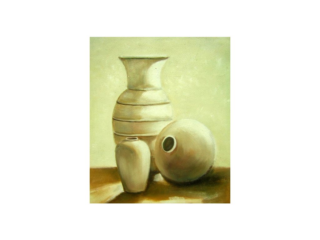 Na obraze je namalováno zátiší se třemi vázami, obraz je laděn do okrové barvy. Obraz je malovaný olejovými barvami na kvalitní malířské plátno vyšší gramáže, napnuté na vypínací (skrytý) 2 cm široký blind rám. Ten je opatřený klínky pro případné dopnutí plátna. Díky probarveným okrajům lze obraz ihned zavěsit na zeď, nebo je možné také zarámování do ozdobného rámu. Nabídku naleznete v sekci rámy a rámování. Součástí je háček určený k zavěšení obrazu.