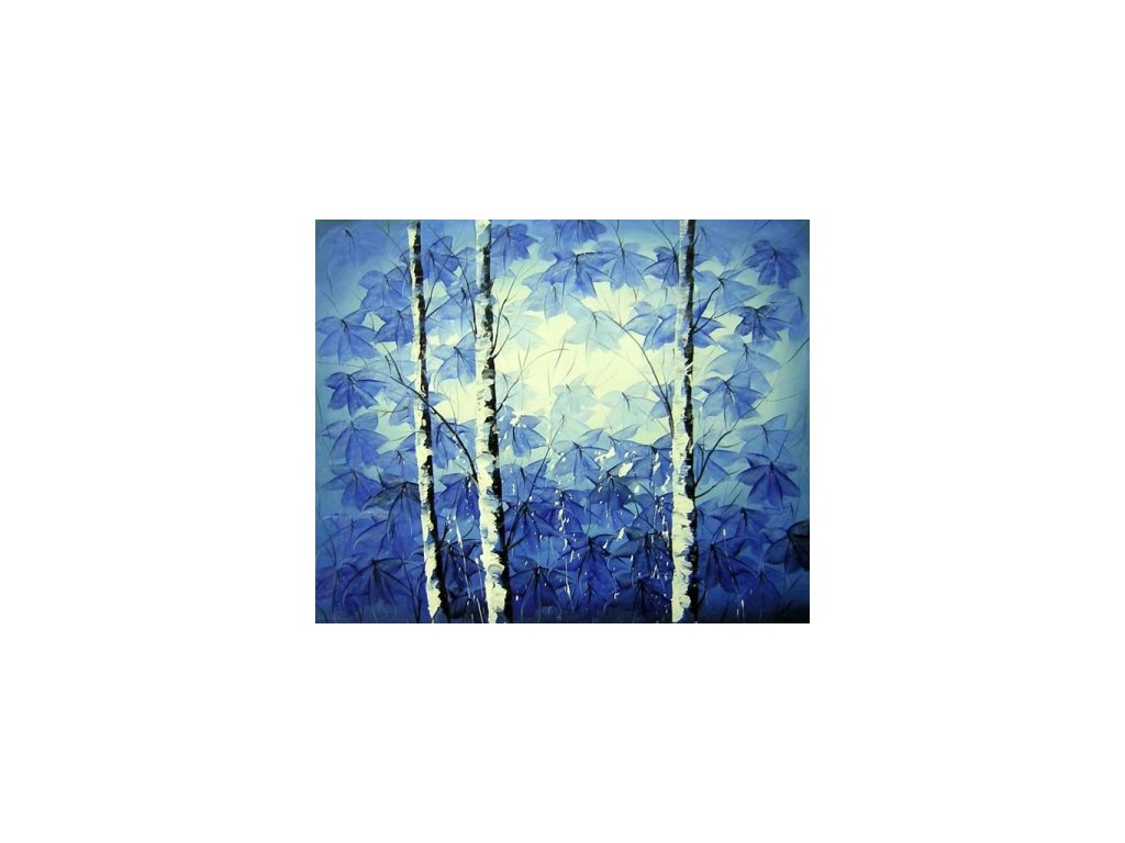 Hlavním motivem jsou tři břízky, celý obraz je laděn do modré barvy. Obraz je malovaný olejovými barvami na kvalitní malířské plátno vyšší gramáže, napnuté na vypínací (skrytý) 2 cm široký blind rám. Ten je opatřený klínky pro případné dopnutí plátna. Díky probarveným okrajům lze obraz ihned zavěsit na zeď, nebo je možné také zarámování do ozdobného rámu. Nabídku naleznete v sekci rámy a rámování. Součástí je háček určený k zavěšení obrazu.