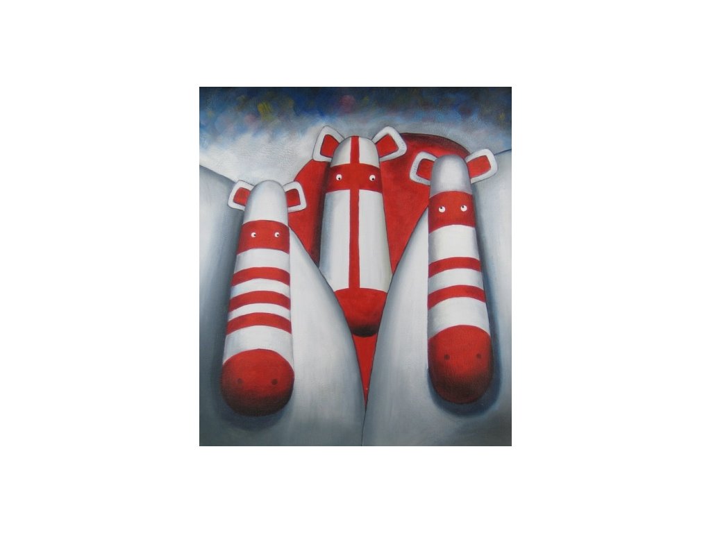 Hlavním motivem jsou tři maskovaní hrošíci v červených pruzích. Obraz je malovaný olejovými barvami na kvalitní malířské plátno vyšší gramáže, napnuté na vypínací (skrytý) 2 cm široký blind rám. Ten je opatřený klínky pro případné dopnutí plátna. Díky probarveným okrajům lze obraz ihned zavěsit na zeď, nebo je možné také zarámování do ozdobného rámu. Nabídku naleznete v sekci rámy a rámování. Součástí je háček určený k zavěšení obrazu.