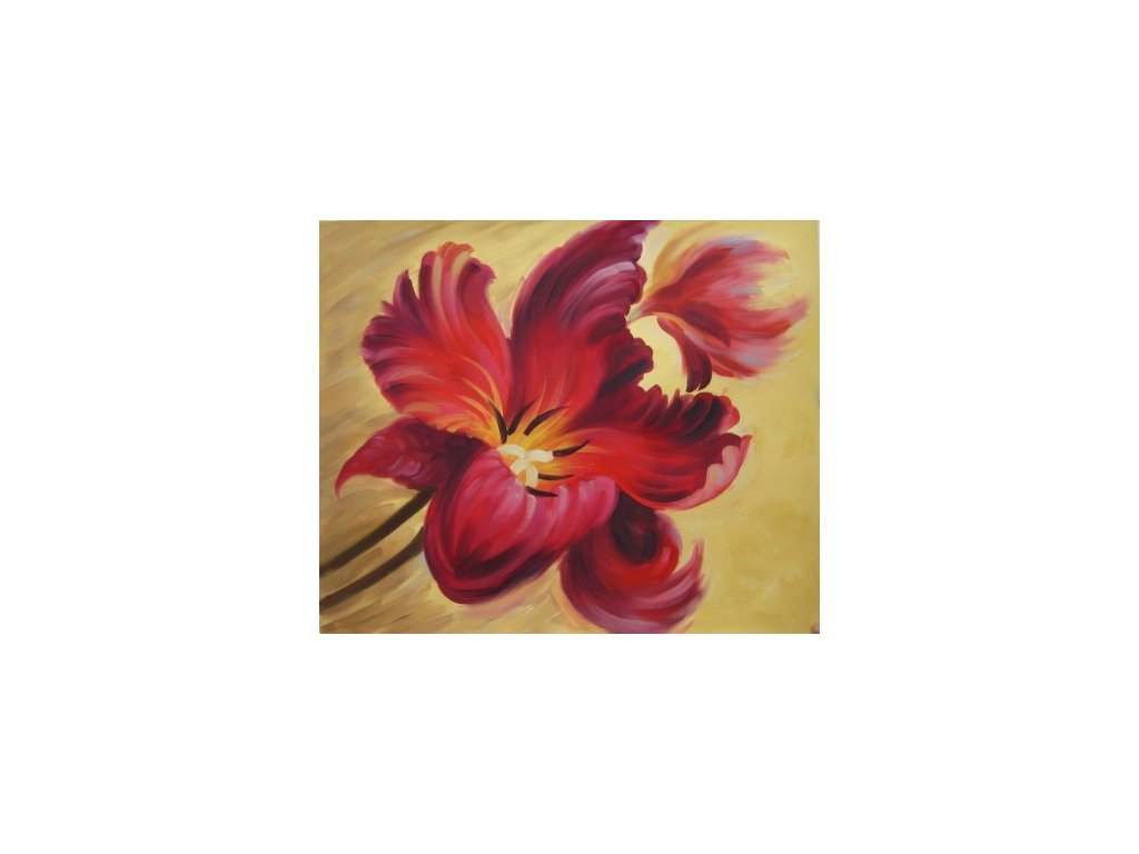 Motivem tohoto obrazu je červený květ na béžovém pozadí. Obraz je malovaný olejovými barvami na kvalitní malířské plátno vyšší gramáže, napnuté na vypínací (skrytý) 2 cm široký blind rám. Ten je opatřený klínky pro případné dopnutí plátna. Díky probarveným okrajům lze obraz ihned zavěsit na zeď, nebo je možné také zarámování do ozdobného rámu. Nabídku naleznete v sekci rámy a rámování. Součástí je háček určený k zavěšení obrazu.