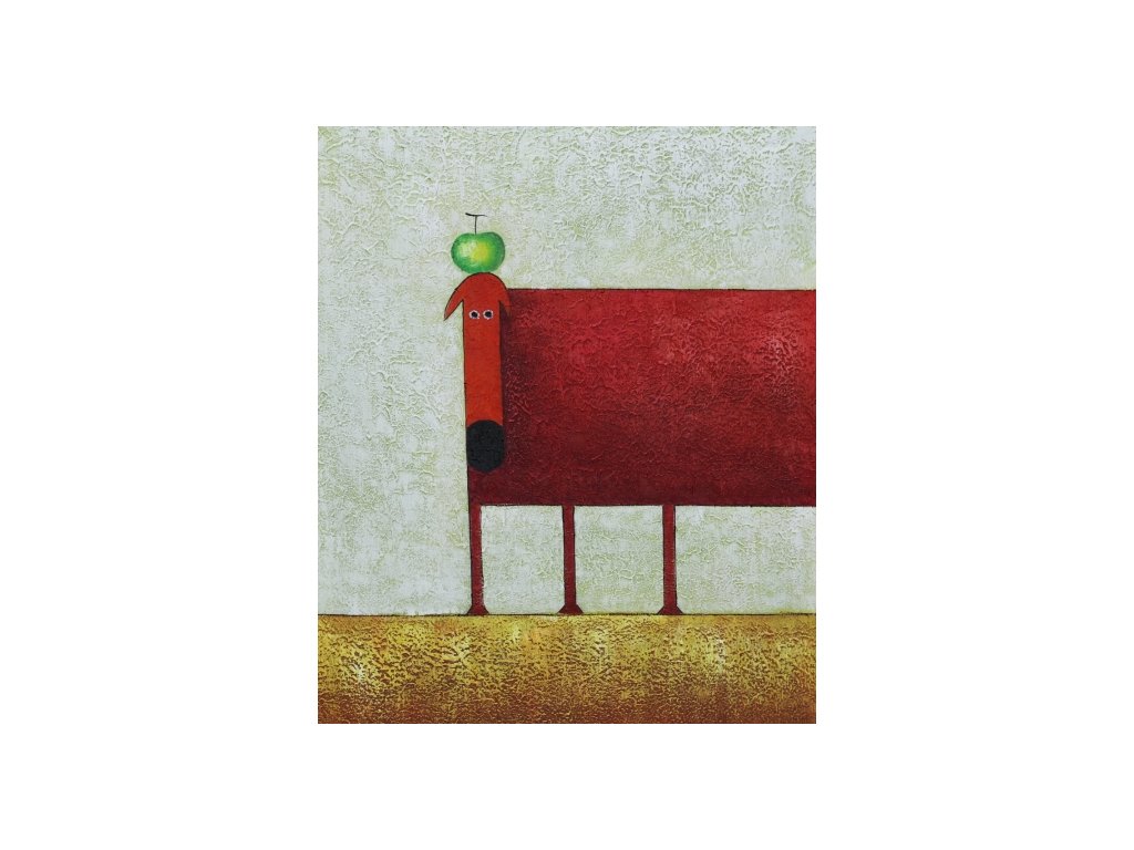Hlavním motivem je moderně namalovaný červený pes s jablkem na hlavě. Obraz je malovaný olejovými barvami na kvalitní malířské plátno vyšší gramáže, napnuté na vypínací (skrytý) 2 cm široký blind rám. Ten je opatřený klínky pro případné dopnutí plátna. Díky probarveným okrajům lze obraz ihned zavěsit na zeď, nebo je možné také zarámování do ozdobného rámu. Nabídku naleznete v sekci rámy a rámování. Součástí je háček určený k zavěšení obrazu. Velikost 60 x 50 cm.