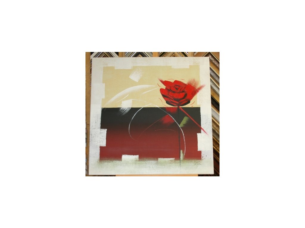 Ručně malovaný obraz olejovými barvami, vypnutý v dřevěném rámu. Hlavním motivem tohoto obrazu je rudá růže, která je zahalena v šedo-bílém okraji. Velikost obrazu 70 x 70 cm.