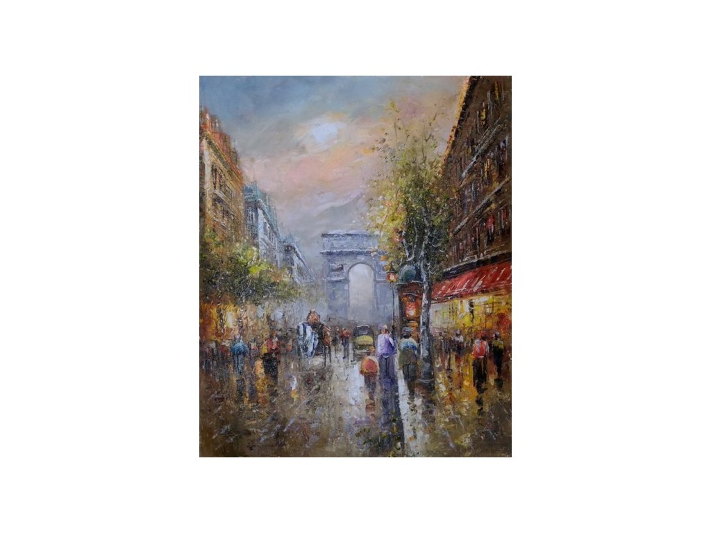 Na obraze je namalována ulice Champs Elysées v Paříži směřující k vítěznému oblouku Arc de Triomphe. Obraz je malovaný olejovými barvami na kvalitní malířské plátno vyšší gramáže, napnuté na vypínací (skrytý) 2 cm široký blind rám. Ten je opatřený klínky pro případné dopnutí plátna. Díky probarveným okrajům lze obraz ihned zavěsit na zeď, nebo je možné také zarámování do ozdobného rámu. Nabídku naleznete v sekci rámy a rámování. Součástí je háček určený k zavěšení obrazu.