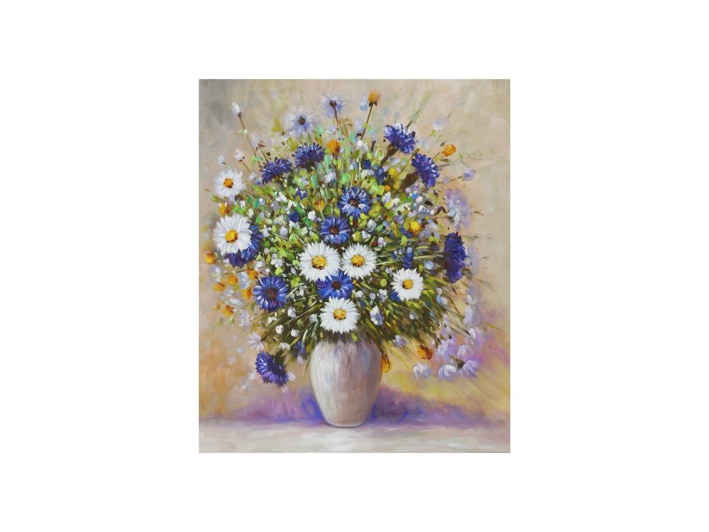 Motivem tohoto obrazu je kytice lučního kvítí z chrp a kopretin ve váze. Obraz je malovaný olejovými barvami na kvalitní malířské plátno vyšší gramáže, napnuté na vypínací (skrytý) 2 cm široký blind rám. Ten je opatřený klínky pro případné dopnutí plátna. Díky probarveným okrajům lze obraz ihned zavěsit na zeď, nebo je možné také zarámování do ozdobného rámu. Nabídku naleznete v sekci rámy a rámování. Součástí je háček určený k zavěšení obrazu. Velikost obrazu je 60 x 50 cm.