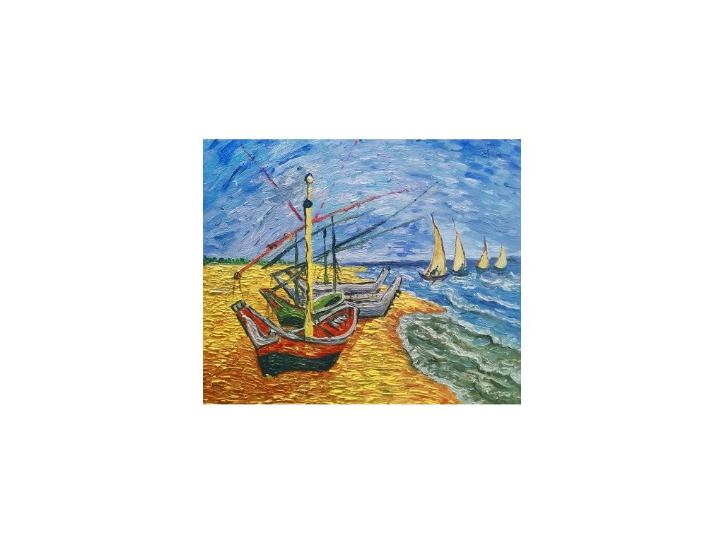 Známá reprodukce od Vincenta Van Gogha obrazu Čluny ze Saintes-Maries. Obraz je malovaný olejovými barvami na kvalitní malířské plátno vyšší gramáže, napnuté na vypínací (skrytý) 2 cm široký blind rám. Ten je opatřený klínky pro případné dopnutí plátna. Díky probarveným okrajům lze obraz ihned zavěsit na zeď, nebo je možné také zarámování do ozdobného rámu. Nabídku naleznete v sekci rámy a rámování. Součástí je háček určený k zavěšení obrazu. Velikost obrazu 50 x 60 cm.