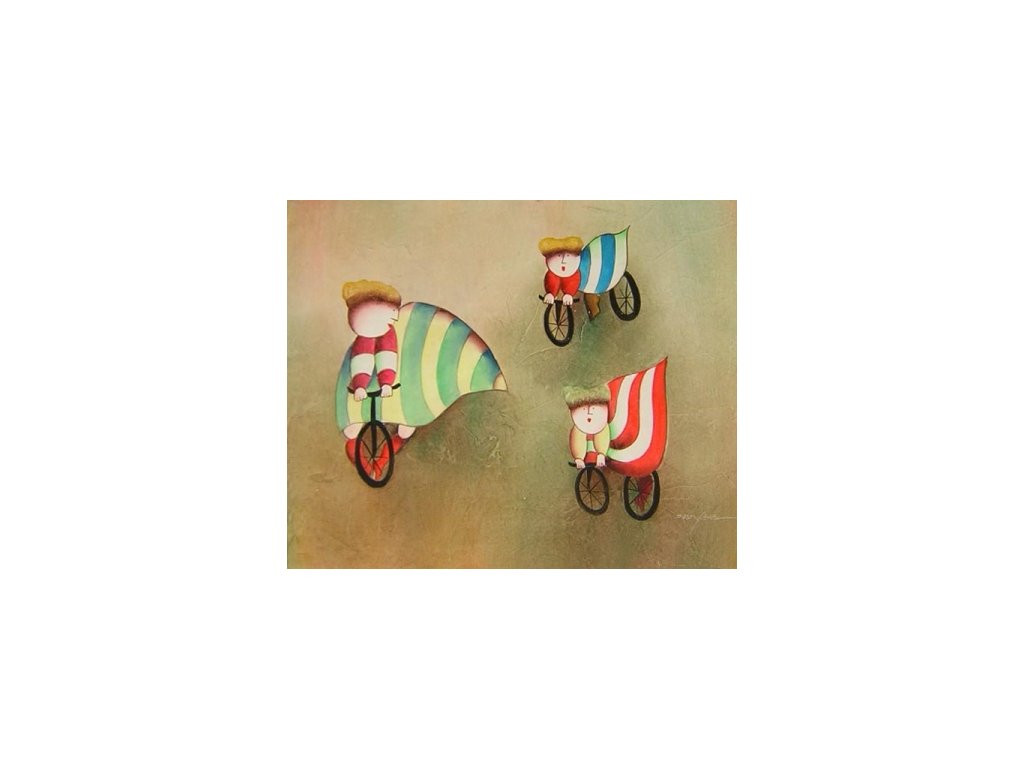 Na obraze jsou tři děti, které jezdí na kolech. Obraz je malovaný olejovými barvami na kvalitní malířské plátno vyšší gramáže, napnuté na vypínací (skrytý) 2 cm široký blind rám. Ten je opatřený klínky pro případné dopnutí plátna. Díky probarveným okrajům lze obraz ihned zavěsit na zeď, nebo je možné také zarámování do ozdobného rámu. Nabídku naleznete v sekci rámy a rámování. Součástí je háček určený k zavěšení obrazu.Buďte prvý, kto napíše príspevok k tejto položke.