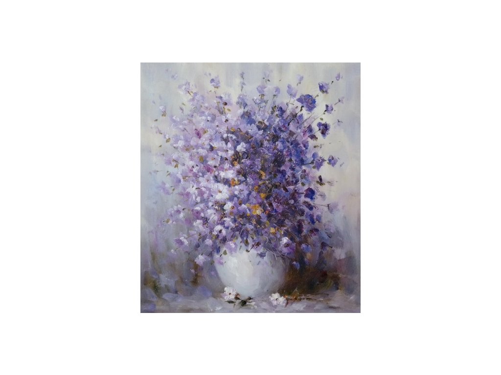 Motivem tohoto obrazu váza s drobnými květinami. Obraz je malovaný olejovými barvami na kvalitní malířské plátno vyšší gramáže, napnuté na vypínací (skrytý) 2 cm široký blind rám. Ten je opatřený klínky pro případné dopnutí plátna. Díky probarveným okrajům lze obraz ihned zavěsit na zeď, nebo je možné také zarámování do ozdobného rámu. Nabídku naleznete v sekci rámy a rámování. Součástí je háček určený k zavěšení obrazu. Velikost obrazu je 60 x 50 cm.