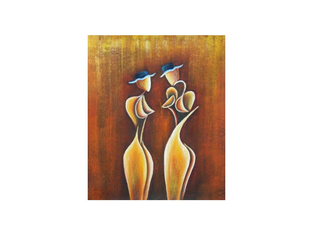 Na obraze jsou namalovány dvě ženy v dlouhých šatech a kloboucích. Obraz je malovaný olejovými barvami na kvalitní malířské plátno vyšší gramáže, napnuté na vypínací (skrytý) 2 cm široký blind rám. Ten je opatřený klínky pro případné dopnutí plátna. Díky probarveným okrajům lze obraz ihned zavěsit na zeď, nebo je možné také zarámování do ozdobného rámu. Nabídku naleznete v sekci rámy a rámování. Součástí je háček určený k zavěšení obrazu.