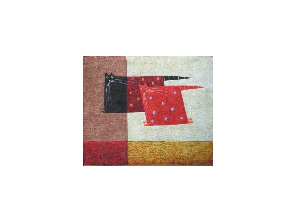 Na obraze jsou moderním způsobem namalované dvě kočky. Obraz je malovaný olejovými barvami na kvalitní malířské plátno vyšší gramáže, napnuté na vypínací (skrytý) 2 cm široký blind rám. Ten je opatřený klínky pro případné dopnutí plátna. Díky probarveným okrajům lze obraz ihned zavěsit na zeď, nebo je možné také zarámování do ozdobného rámu. Nabídku naleznete v sekci rámy a rámování. Součástí je háček určený k zavěšení obrazu.Buďte prvý, kto napíše príspevok k tejto položke.