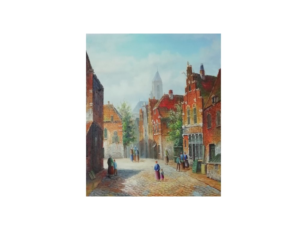 Na obraze je namalována historická ulice. Obraz je malovaný olejovými barvami na kvalitní malířské plátno vyšší gramáže, napnuté na vypínací (skrytý) 2 cm široký blind rám. Ten je opatřený klínky pro případné dopnutí plátna. Díky probarveným okrajům lze obraz ihned zavěsit na zeď, nebo je možné také zarámování do ozdobného rámu. Nabídku naleznete v sekci rámy a rámování. Součástí je háček určený k zavěšení obrazu.Buďte prvý, kto napíše príspevok k tejto položke.
