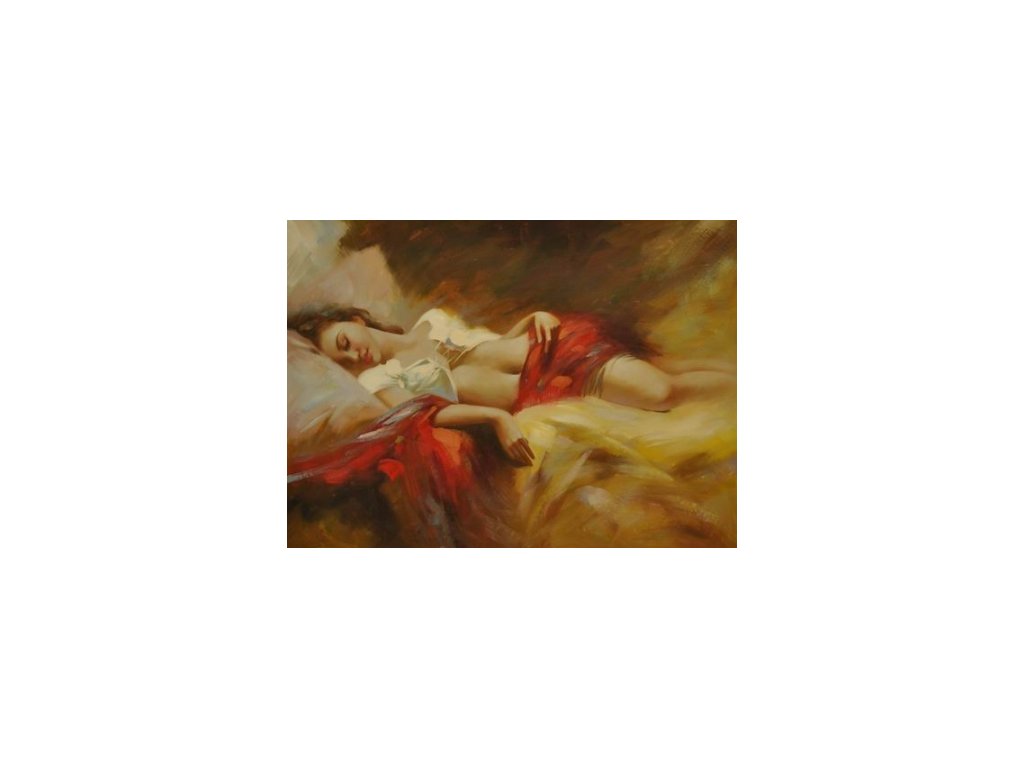 Obraz s motivem spící dívky. Obraz je malovaný olejovými barvami na kvalitní malířské plátno vyšší gramáže, napnuté na vypínací (skrytý) 2 cm široký blind rám. Ten je opatřený klínky pro případné dopnutí plátna. Díky probarveným okrajům lze obraz ihned zavěsit na zeď, nebo je možné také zarámování do ozdobného rámu. Nabídku naleznete v sekci rámy a rámování. Součástí je háček určený k zavěšení obrazu.