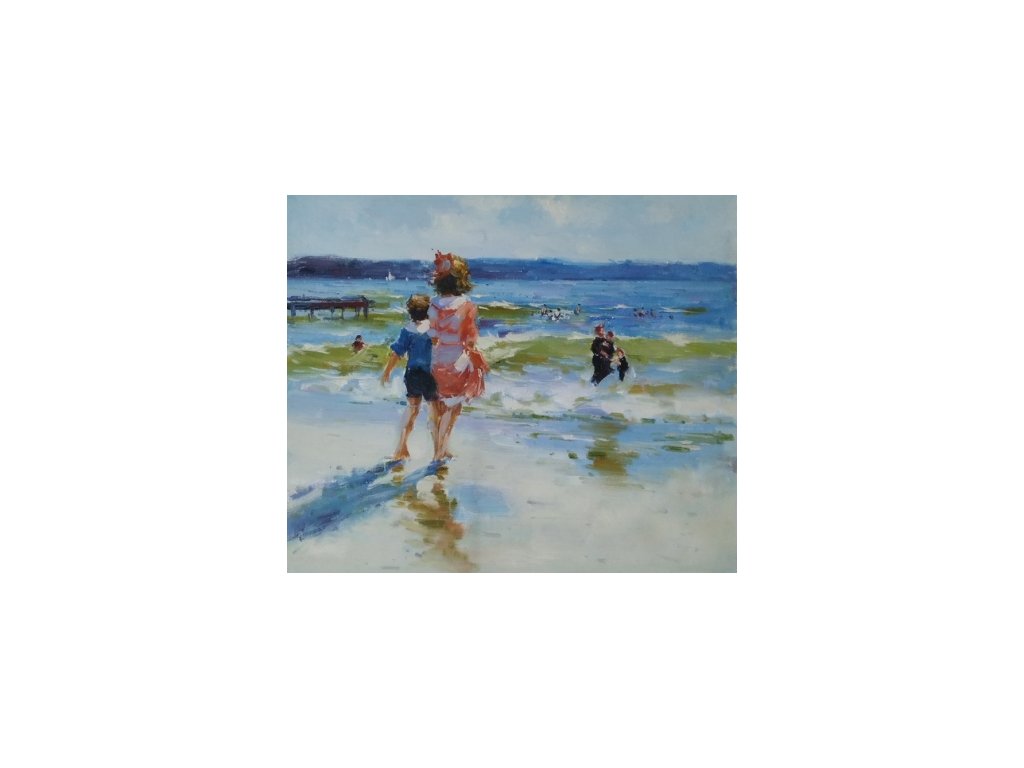 Na obraze jsou zachyceny děti hrající si u moře. Obraz je malovaný olejovými barvami na kvalitní malířské plátno vyšší gramáže, napnuté na vypínací (skrytý) 2 cm široký blind rám. Ten je opatřený klínky pro případné dopnutí plátna. Díky probarveným okrajům lze obraz ihned zavěsit na zeď, nebo je možné také zarámování do ozdobného rámu. Nabídku naleznete v sekci rámy a rámování. Součástí je háček určený k zavěšení obrazu.Buďte prvý, kto napíše príspevok k tejto položke.
