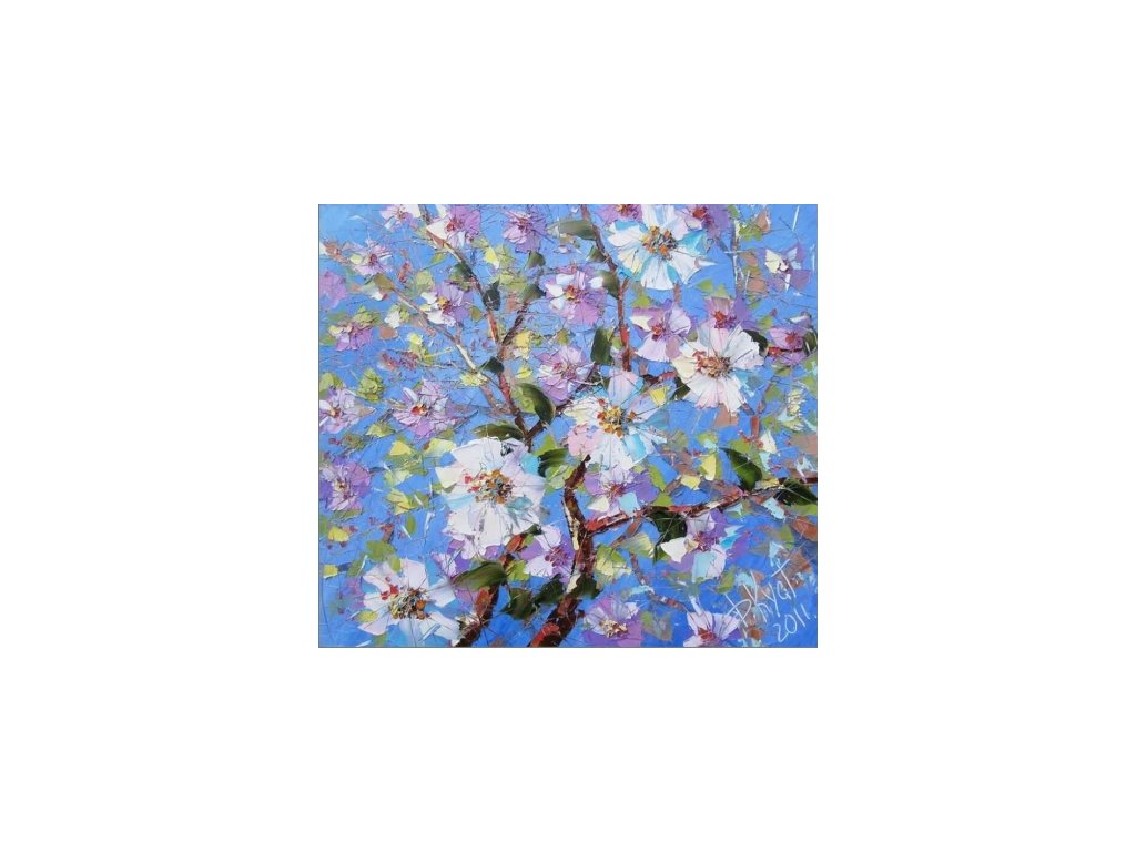 Moderním způsobem malovaný obraz na kterém jsou bílo-růžové květy s jasně modrým nebem. Obraz je malovaný olejovými barvami na kvalitní malířské plátno vyšší gramáže, napnuté na vypínací (skrytý) 2 cm široký blind rám. Ten je opatřený klínky pro případné dopnutí plátna. Díky probarveným okrajům lze obraz ihned zavěsit na zeď, nebo je možné také zarámování do ozdobného rámu. Nabídku naleznete v sekci rámy a rámování. Součástí je háček určený k zavěšení obrazu.Buďte prvý, kto napíše príspevok k tejto položke.