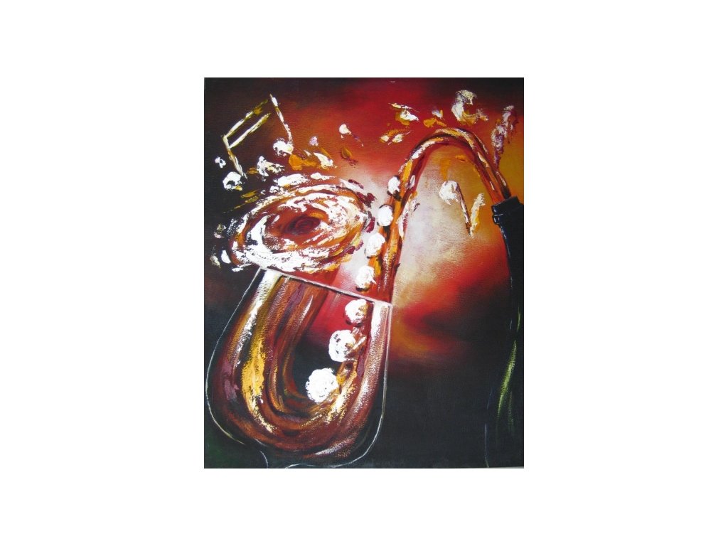 Na obraze je namalováno víno nalévající se do sklenice ve tvaru saxofonu s notami. Obraz je malovaný olejovými barvami na kvalitní malířské plátno vyšší gramáže, napnuté na vypínací (skrytý) 2 cm široký blind rám. Ten je opatřený klínky pro případné dopnutí plátna. Díky probarveným okrajům lze obraz ihned zavěsit na zeď, nebo je možné také zarámování do ozdobného rámu. Nabídku naleznete v sekci rámy a rámování. Součástí je háček určený k zavěšení obrazu.