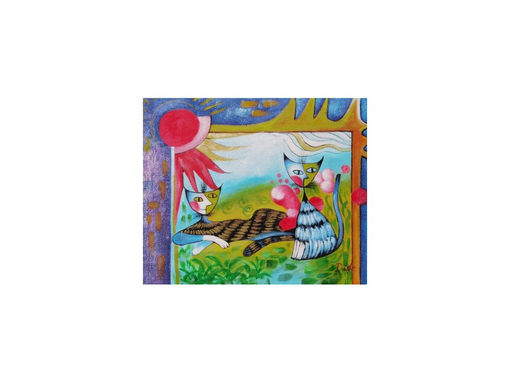 Na obraze je namalován známý motiv svou koček při západu slunce. Obraz je malovaný olejovými barvami na kvalitní malířské plátno vyšší gramáže, napnuté na vypínací (skrytý) 2 cm široký blind rám. Ten je opatřený klínky pro případné dopnutí plátna. Díky probarveným okrajům lze obraz ihned zavěsit na zeď, nebo je možné také zarámování do ozdobného rámu. Nabídku naleznete v sekci rámy a rámování. Součástí je háček určený k zavěšení obrazu. Velikost obrazu je 50 x 60 cm.