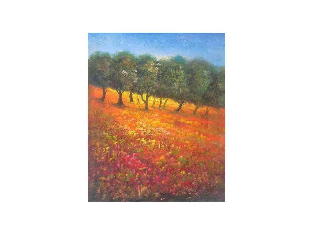 Motivem obrazu je krajina se sadem, obraz má připomenout krásný den. Obraz je malovaný olejovými barvami na kvalitní malířské plátno vyšší gramáže, napnuté na vypínací (skrytý) 2 cm široký blind rám. Ten je opatřený klínky pro případné dopnutí plátna. Díky probarveným okrajům lze obraz ihned zavěsit na zeď, nebo je možné také zarámování do ozdobného rámu. Nabídku naleznete v sekci rámy a rámování. Součástí je háček určený k zavěšení obrazu.Buďte prvý, kto napíše príspevok k tejto položke.