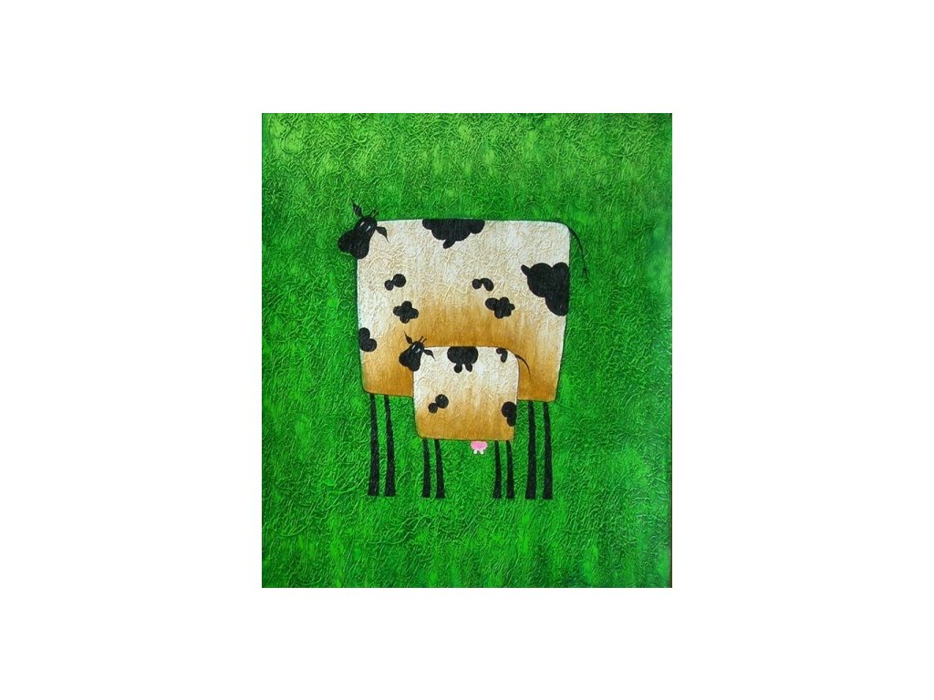 Moderním způsobem namalovaná kráva s telátkem na zeleném pozadí. Obraz je malovaný olejovými barvami na kvalitní malířské plátno vyšší gramáže, napnuté na vypínací (skrytý) 2 cm široký blind rám. Ten je opatřený klínky pro případné dopnutí plátna. Díky probarveným okrajům lze obraz ihned zavěsit na zeď, nebo je možné také zarámování do ozdobného rámu. Nabídku naleznete v sekci rámy a rámování. Součástí je háček určený k zavěšení obrazu.Buďte prvý, kto napíše príspevok k tejto položke.