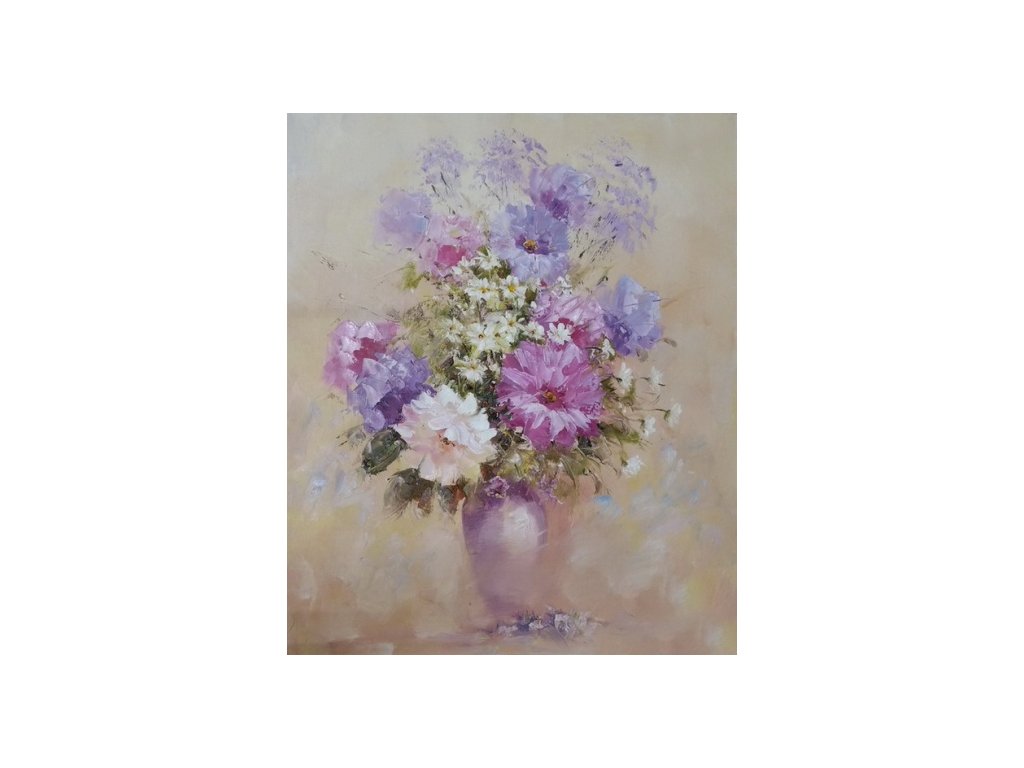 Motivem tohoto obrazu je váza s květinami. Obraz je malovaný olejovými barvami na kvalitní malířské plátno vyšší gramáže, napnuté na vypínací (skrytý) 2 cm široký blind rám. Ten je opatřený klínky pro případné dopnutí plátna. Díky probarveným okrajům lze obraz ihned zavěsit na zeď, nebo je možné také zarámování do ozdobného rámu. Nabídku naleznete v sekci rámy a rámování. Součástí je háček určený k zavěšení obrazu.