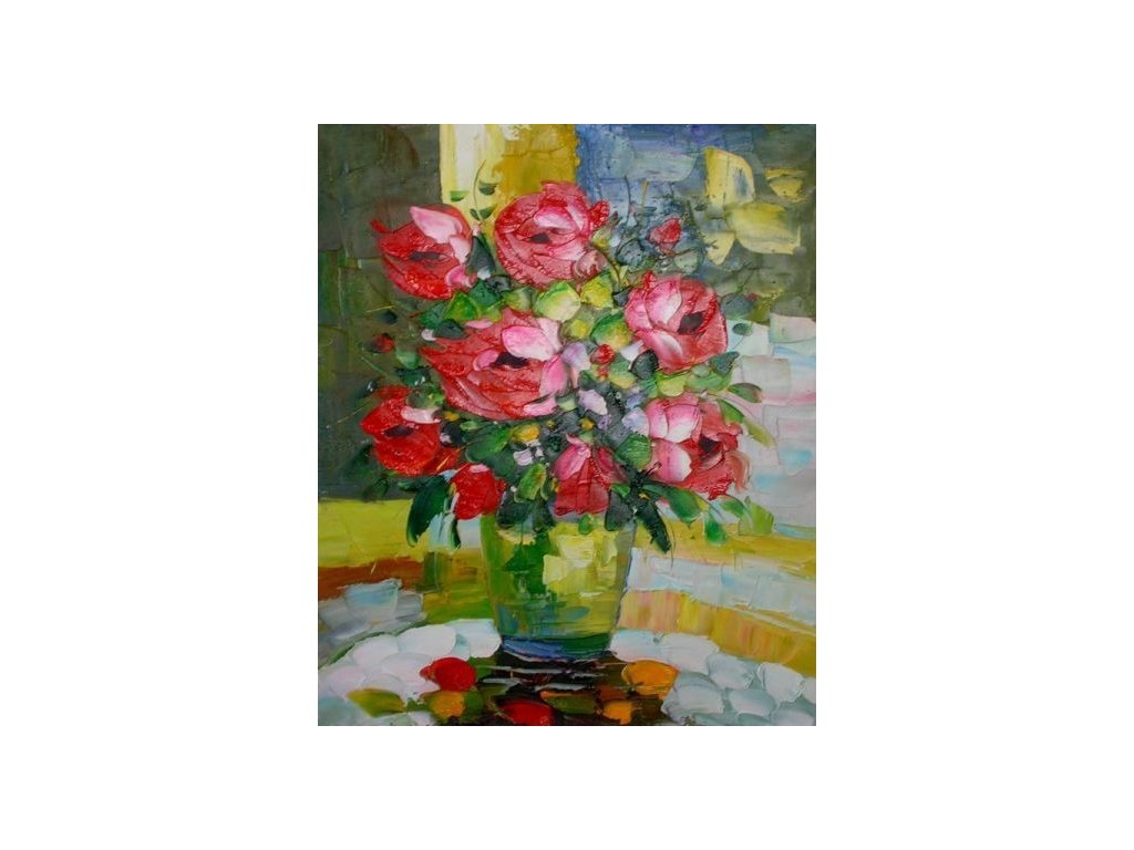 Hlavním motivem je váza s kyticí rudých květů. Obraz je malovaný olejovými barvami na kvalitní malířské plátno vyšší gramáže, napnuté na vypínací (skrytý) 2 cm široký blind rám. Ten je opatřený klínky pro případné dopnutí plátna. Díky probarveným okrajům lze obraz ihned zavěsit na zeď, nebo je možné také zarámování do ozdobného rámu. Nabídku naleznete v sekci rámy a rámování. Součástí je háček určený k zavěšení obrazu.