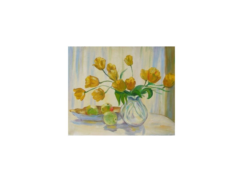 Hlavním motivem je váza s žlutými květy tulipánů na stole před oknem. Obraz je malovaný olejovými barvami na kvalitní malířské plátno vyšší gramáže, napnuté na vypínací (skrytý) 2 cm široký blind rám. Ten je opatřený klínky pro případné dopnutí plátna. Díky probarveným okrajům lze obraz ihned zavěsit na zeď, nebo je možné také zarámování do ozdobného rámu. Nabídku naleznete v sekci rámy a rámování. Součástí je háček určený k zavěšení obrazu.Buďte prvý, kto napíše príspevok k tejto položke.