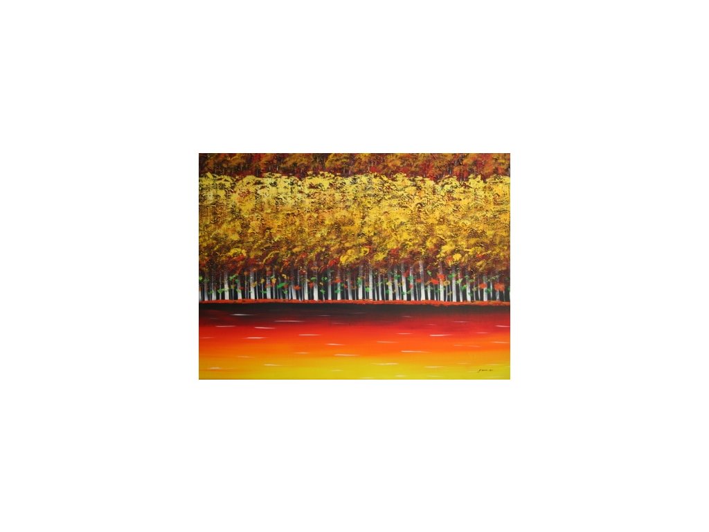 Ručně malovaný obraz olejovými barvami na plátně, vypnutý na dřevěném vypínacím blind rámu s vypínacími klínky, které umožní případnou korekci plátna. Motivem tohoto obrazu jsou zlaté stromy v lese. Obraz je možné zarámovat do dřevěného ozdobného rámu, nebo jej opatřit dřevěnou ozdobnou lištou, nabídku naleznete v sekci Rámy a rámování. Velikost obrazu 90 x 120 cm.