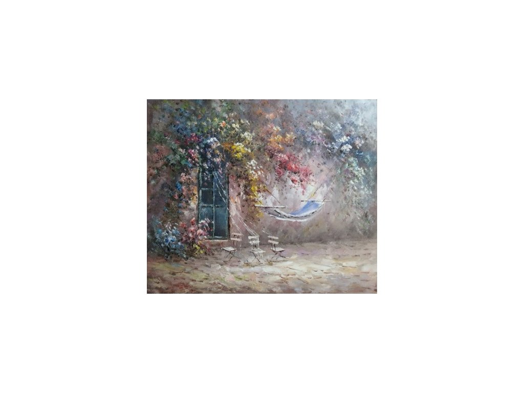 Zákoutí s květinami a houpací sítí. Obraz je malovaný olejovými barvami na kvalitní malířské plátno vyšší gramáže, napnuté na vypínací (skrytý) 2 cm široký blind rám. Ten je opatřený klínky pro případné dopnutí plátna. Díky probarveným okrajům lze obraz ihned zavěsit na zeď, nebo je možné také zarámování do ozdobného rámu. Nabídku naleznete v sekci rámy a rámování. Součástí je háček určený k zavěšení obrazu.Buďte prvý, kto napíše príspevok k tejto položke.