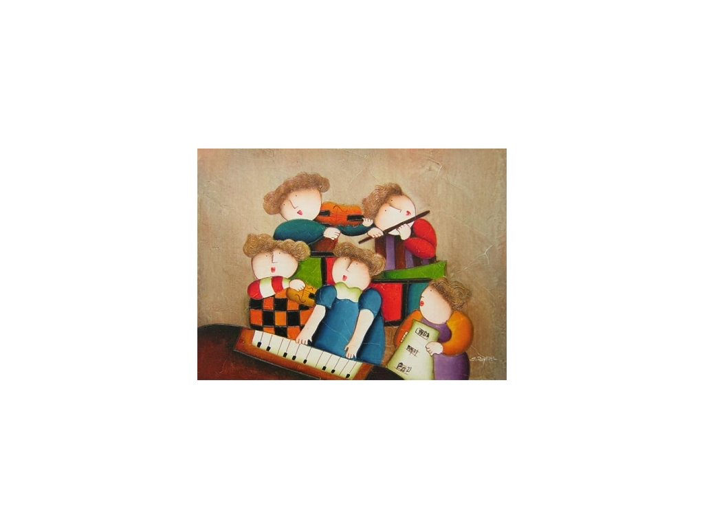 Obraz s motivem dětí hrajících v kapele. Obraz je malovaný olejovými barvami na kvalitní malířské plátno vyšší gramáže, napnuté na vypínací (skrytý) 2 cm široký blind rám. Ten je opatřený klínky pro případné dopnutí plátna. Díky probarveným okrajům lze obraz ihned zavěsit na zeď, nebo je možné také zarámování do ozdobného rámu. Nabídku naleznete v sekci rámy a rámování. Součástí je háček určený k zavěšení obrazu.