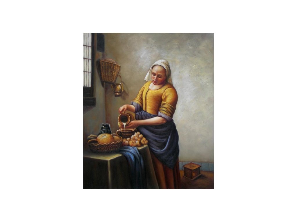 Obraz s motivem Mlékařky, kterou v originále namaloval Joannes Jan Vermeer Van Delft. Obraz je malovaný olejovými barvami na kvalitní malířské plátno vyšší gramáže, napnuté na vypínací (skrytý) 2 cm široký blind rám. Ten je opatřený klínky pro případné dopnutí plátna. Díky probarveným okrajům lze obraz ihned zavěsit na zeď, nebo je možné také zarámování do ozdobného rámu. Nabídku naleznete v sekci rámy a rámování. Součástí je háček určený k zavěšení obrazu.Buďte prvý, kto napíše príspevok k tejto položke.