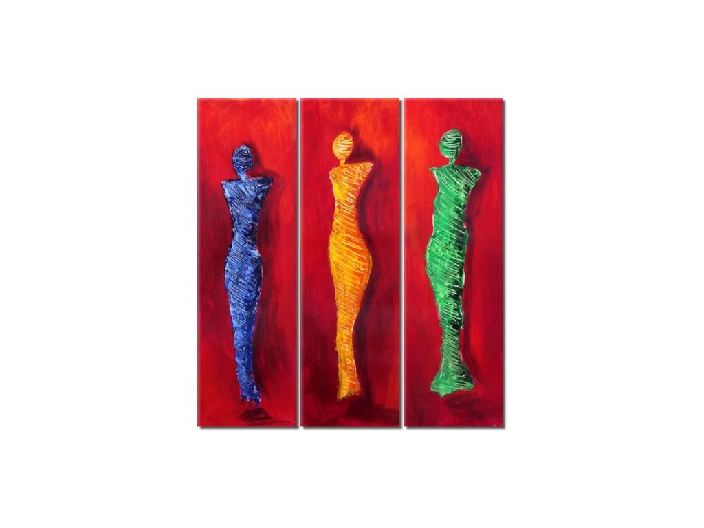 3x 120 cm x 35 cm Ručně malovaný olejový 3 dílný obrazový set na plátně. Je vypnutý na rámu, který umožňuje případnou korekci plátna. Obrazový set se skládá ze tří samostatných obrazů, které se vzájemně doplňují. Motivem tohoto setu jsou tři dámy v červených, žlutých a zelených šatech. Obraz je vhodným doplňkem každého interiéru.