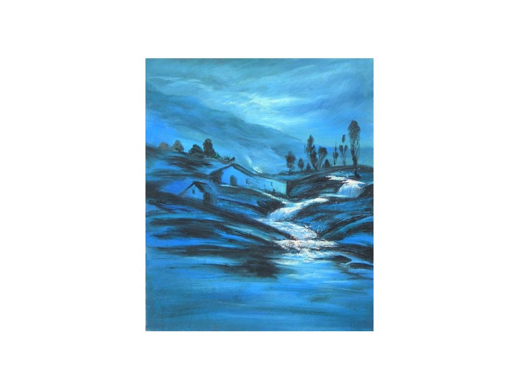 Na obraze je namalována modrá vesnice v modrém oparu. Obraz je malovaný olejovými barvami na kvalitní malířské plátno vyšší gramáže, napnuté na vypínací (skrytý) 2 cm široký blind rám. Ten je opatřený klínky pro případné dopnutí plátna. Díky probarveným okrajům lze obraz ihned zavěsit na zeď, nebo je možné také zarámování do ozdobného rámu. Nabídku naleznete v sekci rámy a rámování. Součástí je háček určený k zavěšení obrazu.Buďte prvý, kto napíše príspevok k tejto položke.
