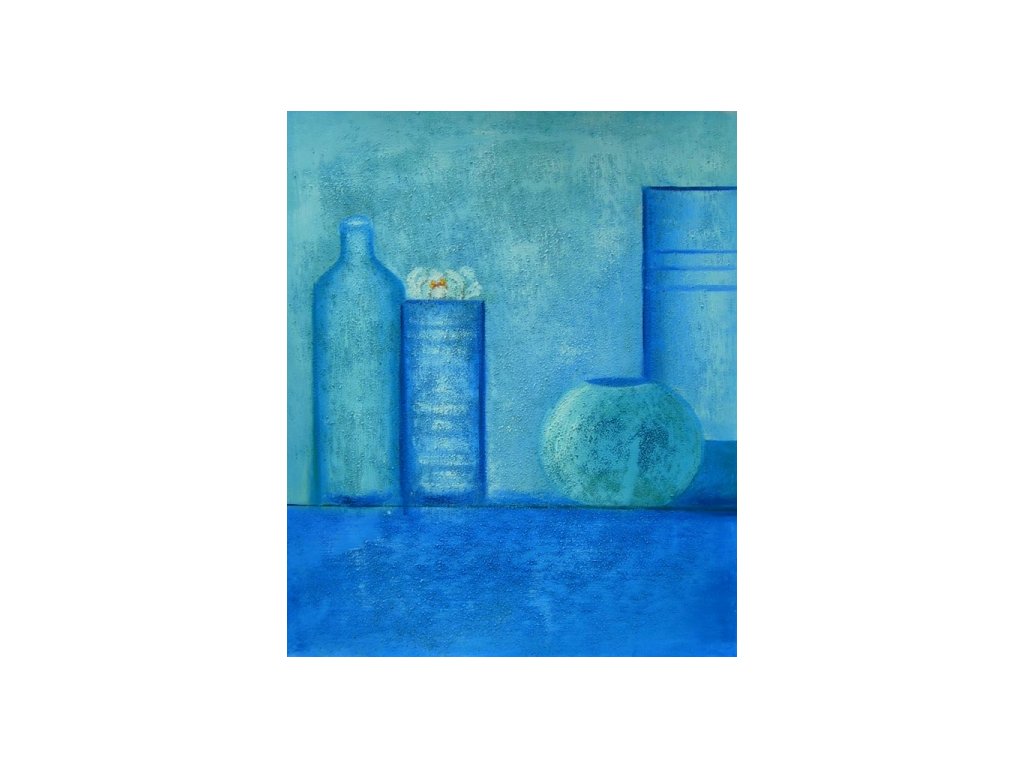 Na obraze jsou namalovány modré nádoby a je celý laděný do modré barvy. Obraz je malovaný olejovými barvami na kvalitní malířské plátno vyšší gramáže, napnuté na vypínací (skrytý) 2 cm široký blind rám. Ten je opatřený klínky pro případné dopnutí plátna. Díky probarveným okrajům lze obraz ihned zavěsit na zeď, nebo je možné také zarámování do ozdobného rámu. Nabídku naleznete v sekci rámy a rámování. Součástí je háček určený k zavěšení obrazu.