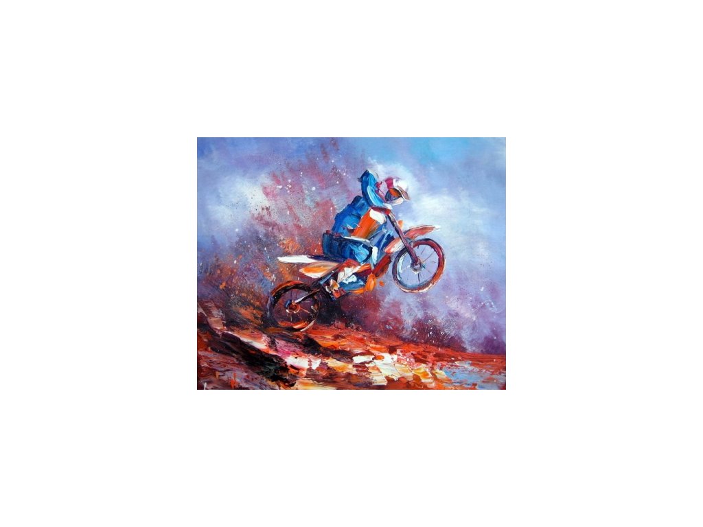 Na obraze je namalován motokrosař při jízdě v terénu. Obraz je malovaný olejovými barvami na kvalitní malířské plátno vyšší gramáže, napnuté na vypínací (skrytý) 2 cm široký blind rám. Ten je opatřený klínky pro případné dopnutí plátna. Díky probarveným okrajům lze obraz ihned zavěsit na zeď, nebo je možné také zarámování do ozdobného rámu. Nabídku naleznete v sekci rámy a rámování. Součástí je háček určený k zavěšení obrazu.Buďte prvý, kto napíše príspevok k tejto položke.