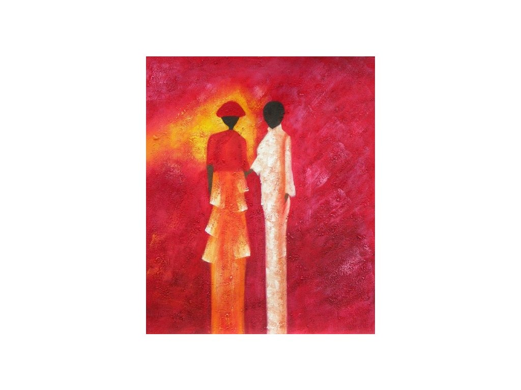 Na obraze je namalován pár v červených a bílích šatech na schůzce. Obraz je malovaný olejovými barvami na kvalitní malířské plátno vyšší gramáže, napnuté na vypínací (skrytý) 2 cm široký blind rám. Ten je opatřený klínky pro případné dopnutí plátna. Díky probarveným okrajům lze obraz ihned zavěsit na zeď, nebo je možné také zarámování do ozdobného rámu. Nabídku naleznete v sekci rámy a rámování. Součástí je háček určený k zavěšení obrazu.