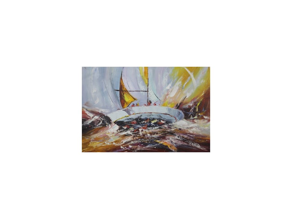 Na obraze je namalována sportovní loď plující na rozbouřeném moři. Obraz je malovaný olejovými barvami na kvalitní malířské plátno vyšší gramáže, napnuté na vypínací (skrytý) 2 cm široký blind rám. Ten je opatřený klínky pro případné dopnutí plátna. Díky probarveným okrajům lze obraz ihned zavěsit na zeď, nebo je možné také zarámování do ozdobného rámu. Nabídku naleznete v sekci rámy a rámování. Součástí je háček určený k zavěšení obrazu. Velikost obrazu je 60 x 90 cm.