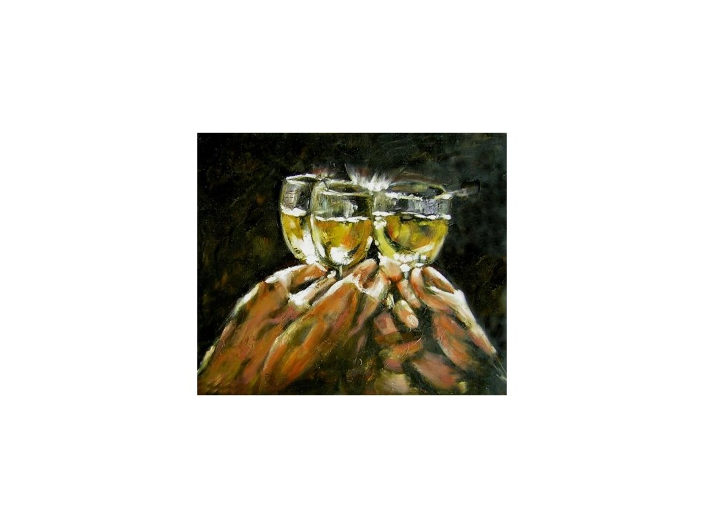 Na obraze jsou namalovány sklenice vína ťukající o sebe na zdraví. Obraz je malovaný olejovými barvami na kvalitní malířské plátno vyšší gramáže, napnuté na vypínací (skrytý) 2 cm široký blind rám. Ten je opatřený klínky pro případné dopnutí plátna. Díky probarveným okrajům lze obraz ihned zavěsit na zeď, nebo je možné také zarámování do ozdobného rámu. Nabídku naleznete v sekci rámy a rámování. Součástí je háček určený k zavěšení obrazu.