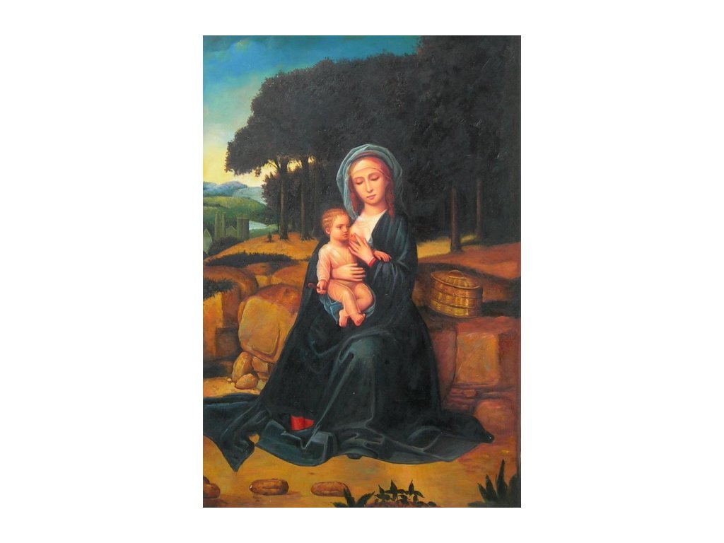 Obraz s náboženským motivem sedící Marie s Jezulátkem. Obraz je malovaný olejovými barvami na kvalitní malířské plátno vyšší gramáže, napnuté na vypínací (skrytý) 2 cm široký blind rám. Ten je opatřený klínky pro případné dopnutí plátna. Díky probarveným okrajům lze obraz ihned zavěsit na zeď, nebo je možné také zarámování do ozdobného rámu. Nabídku naleznete v sekci rámy a rámování. Součástí je háček určený k zavěšení obrazu.