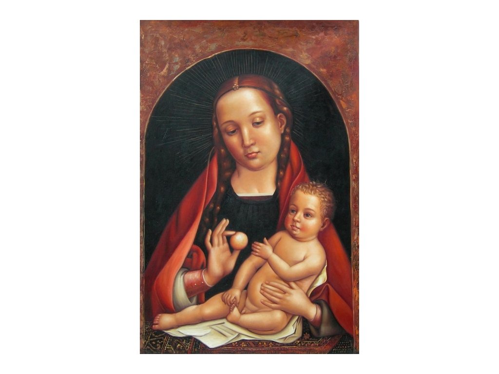 Na obraze je náboženský motiv ženy s dítětem. Obraz je malovaný olejovými barvami na kvalitní malířské plátno vyšší gramáže, napnuté na vypínací (skrytý) 2 cm široký blind rám. Ten je opatřený klínky pro případné dopnutí plátna. Díky probarveným okrajům lze obraz ihned zavěsit na zeď, nebo je možné také zarámování do ozdobného rámu. Nabídku naleznete v sekci rámy a rámování. Součástí je háček určený k zavěšení obrazu.