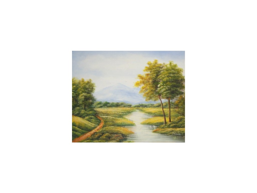 Na obraze je klasickým způsobem namalovaná krajina s cestou a řekou. Obraz je malovaný olejovými barvami na kvalitní malířské plátno vyšší gramáže, napnuté na vypínací (skrytý) 2 cm široký blind rám. Ten je opatřený klínky pro případné dopnutí plátna. Díky probarveným okrajům lze obraz ihned zavěsit na zeď, nebo je možné také zarámování do ozdobného rámu. Nabídku naleznete v sekci rámy a rámování. Součástí je háček určený k zavěšení obrazu. Velikost obrazu 50 x 60 cm.