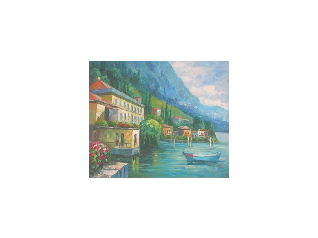 Na obraze je namalováno moře kde je loďka připlouvající k domům na pobřeží. Obraz je malovaný olejovými barvami na kvalitní malířské plátno vyšší gramáže, napnuté na vypínací (skrytý) 2 cm široký blind rám. Ten je opatřený klínky pro případné dopnutí plátna. Díky probarveným okrajům lze obraz ihned zavěsit na zeď, nebo je možné také zarámování do ozdobného rámu. Nabídku naleznete v sekci rámy a rámování. Součástí je háček určený k zavěšení obrazu.