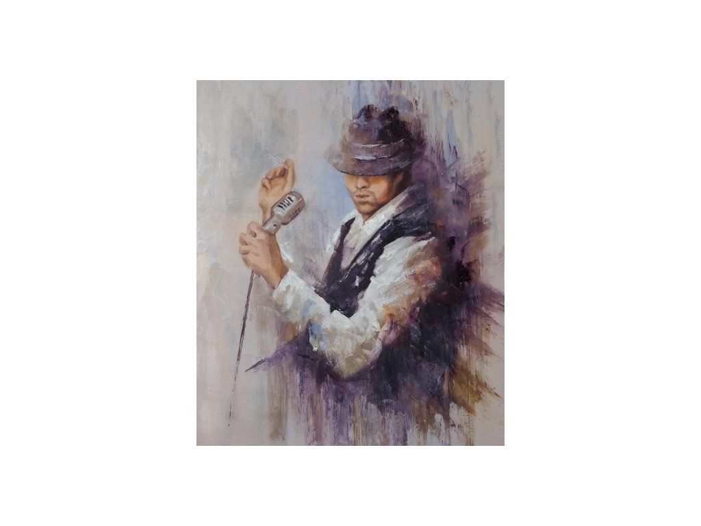 Obraz zachycuje muzikanta při vystoupení. Obraz je malovaný olejovými barvami na kvalitní malířské plátno vyšší gramáže, napnuté na vypínací (skrytý) 2 cm široký blind rám. Ten je opatřený klínky pro případné dopnutí plátna. Díky probarveným okrajům lze obraz ihned zavěsit na zeď, nebo je možné také zarámování do ozdobného rámu. Nabídku naleznete v sekci rámy a rámování. Součástí je háček určený k zavěšení obrazu.Buďte prvý, kto napíše príspevok k tejto položke.